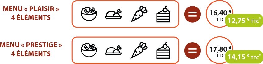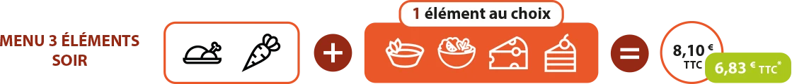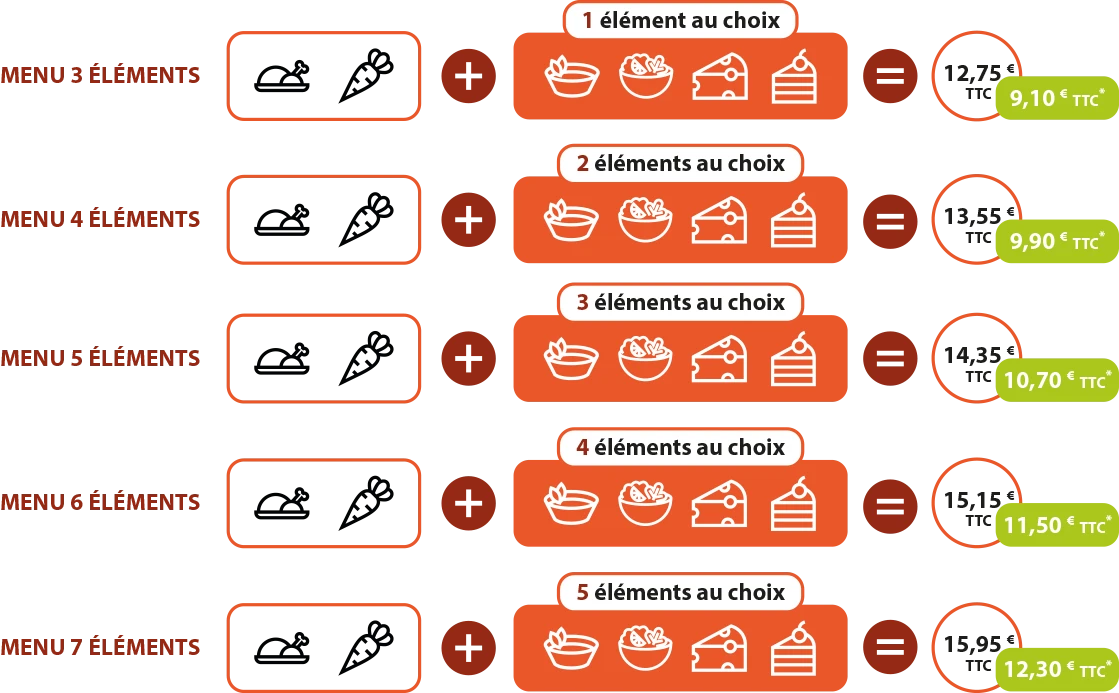 Nous proposons différents menus modulables, de 3 à 7 éléments, afin de répondre aux besoins et aux envies de chacun. Chaque formule comprend un plat, une garniture et plusieurs éléments au choix parmi entrée, dessert, produit laitier ou potage. Une solution flexible qui garantit équilibre et diversité au quotidien.